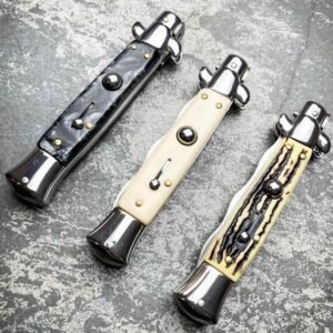 The Godfather Stiletto Knife Classic Italian Style Switchblade Automatic Knives – KRIS – 9″. The handle has acrylic or wooden top and bottom scales. The push button quickly releases the wavy blade with Silver Mirror Finished, then use the pivot support to close and secure with front-mounted safety. Available in multiple colors.